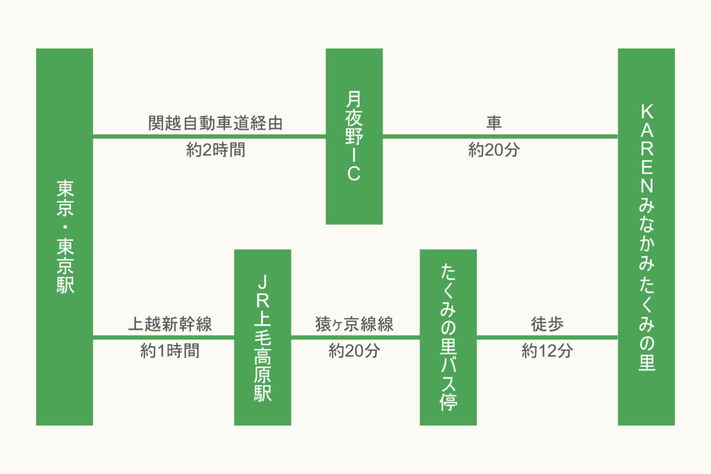 ・上毛高原駅バス停→たくみの里バス停→徒歩で約12分